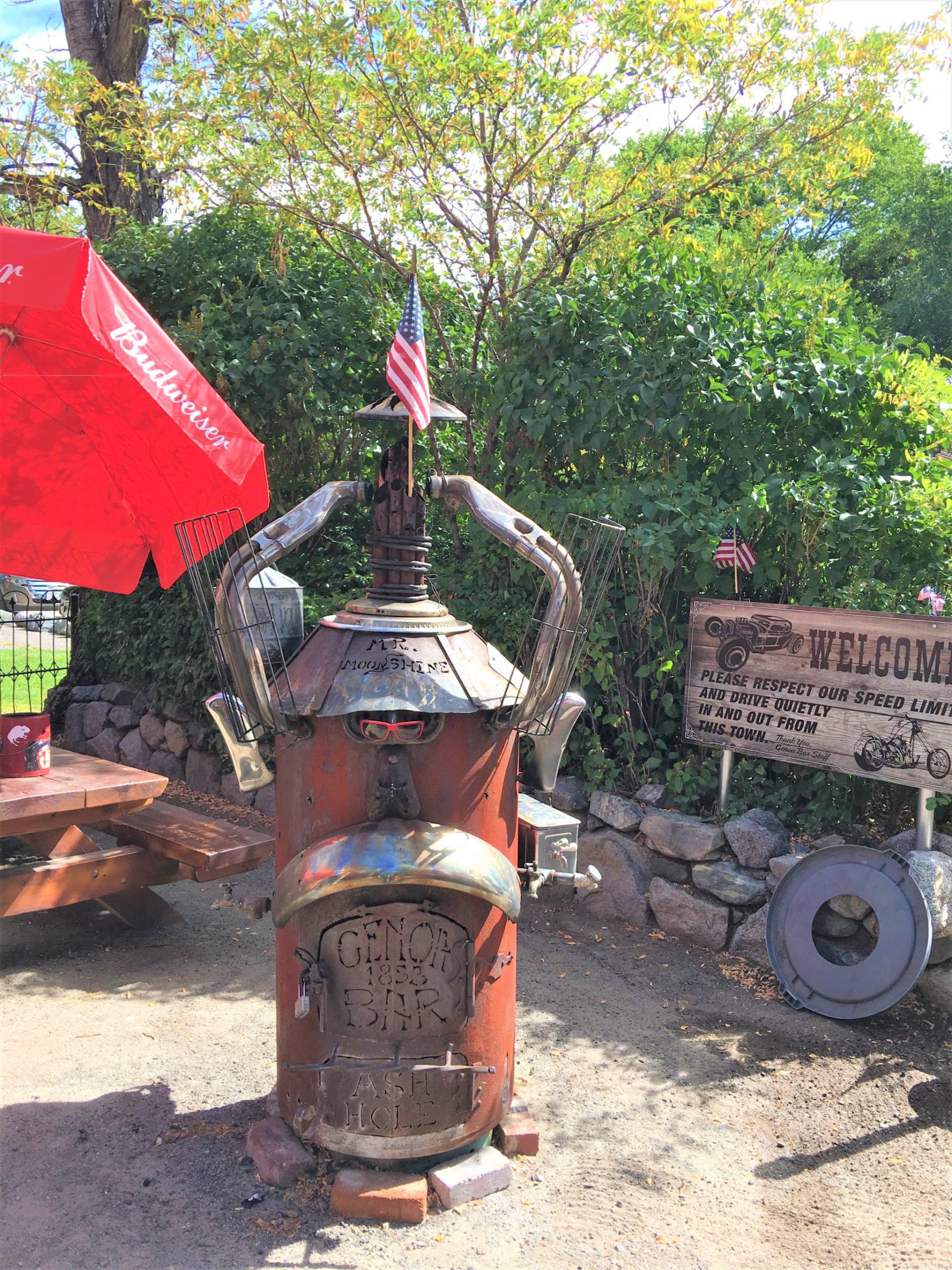 そしてその隣にあるのがネバダ州最古の酒場である Genoa Bar and Saloon。創業1853年。時代を感じる煉瓦造りの建物が真のアーリーアメリカンです。庭には今も使われているレトロなストーブがありMr. Moonshineと名付けられてて名物フォトオブジェになってます。小さな村だけど24時間営業してます!