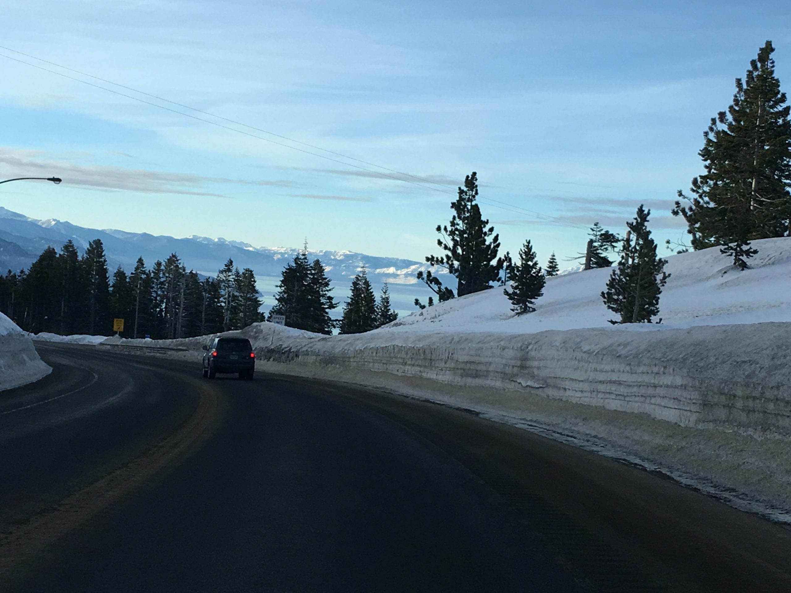 今冬は積雪が例年より多く、リノ・タホ―周辺のスキー場はどこもここ数年来久々の抜群のゲレンデ・コンディション。お天気と気温がマイルドな日を選び Diamond Peak Ski Resort へ。リノからMt.Rose Hwyのシーニック・ドライブを経てタホ湖もチラ見しながらスキー場へ。結構な降雪があった日から5日を経ていて道路はチェーン規制もなくクリアで安心ドライブ。リノ市内から小一時間もかからないでした。
