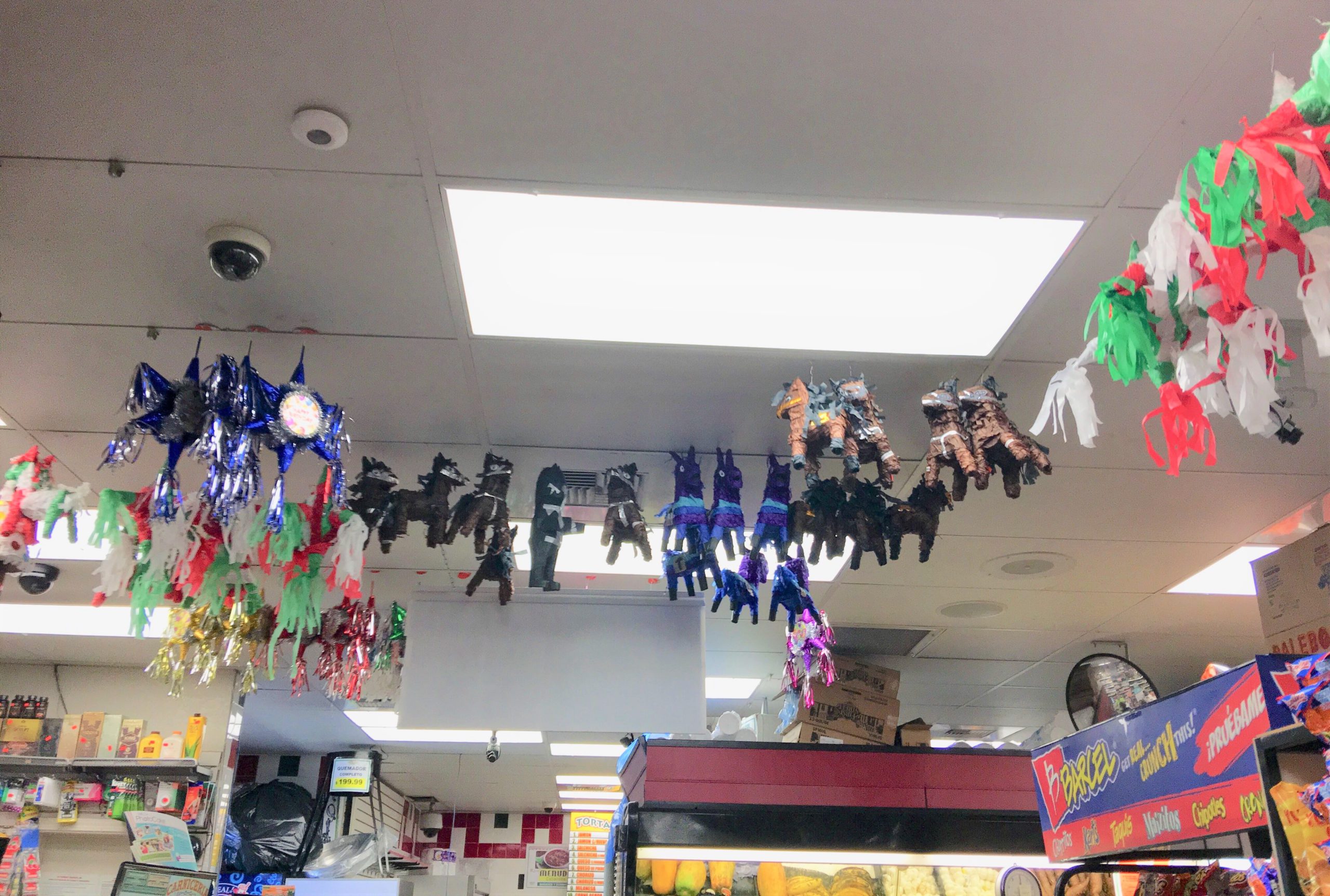 メキシコの子供の誕生日会で欠かせないピニャータ(中にキャンディを詰め、目隠しをしたお誕生日の子供に棒かなんかで割らせ、誕生日会に参加した子供たちでキャンディを拾うというゲーム。日本のスイカ割りとやや似てるかな。)も天井からいっぱい吊るされて販売されてます。タコス、トルティーヤは言うまでもなく、見たことないメキシカンなお菓子やモーレ・ペースト等のメキシカンならではの食材もあります。